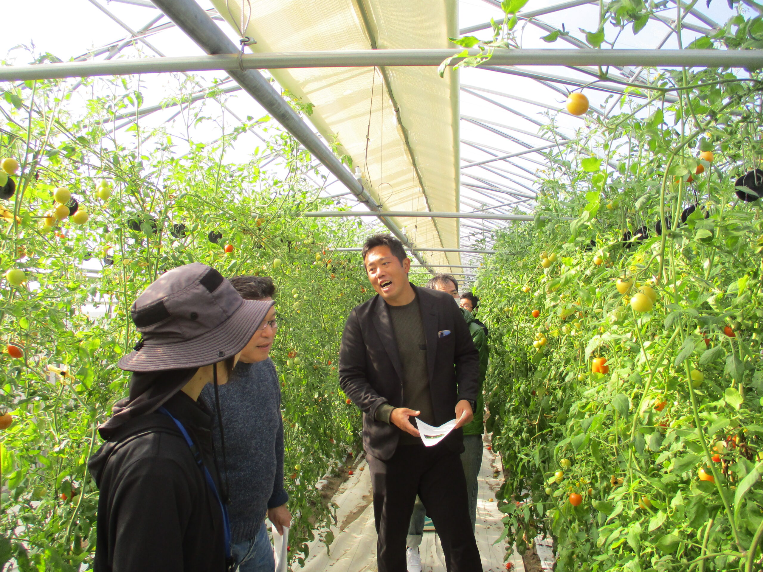 就農までの経緯を聞いた後、ミデイトマトのハウスに入りお話を聞き試食もさせていただきました。