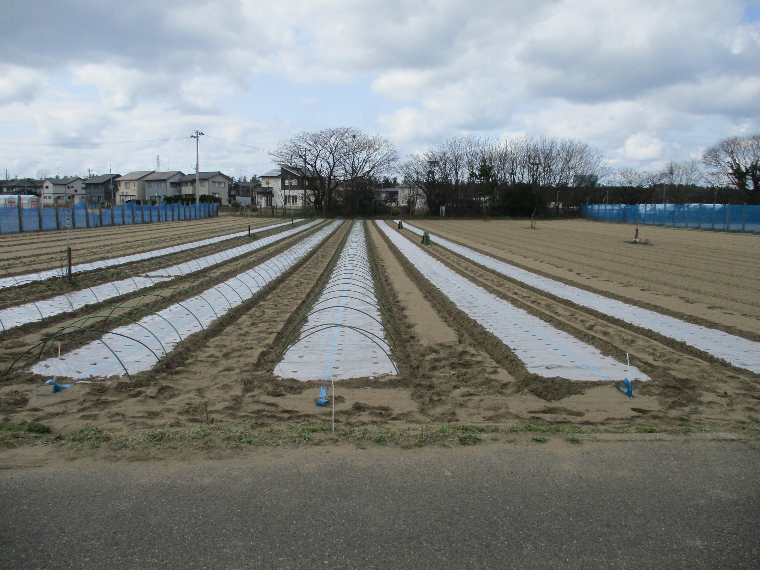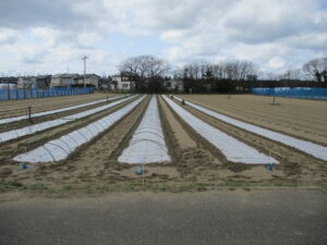 播種が終わると、弓と呼ばれるものを置きビニールで覆います。