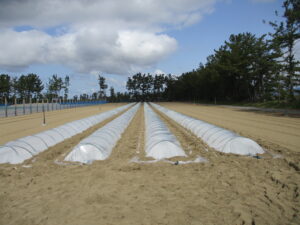 露地では、ダイコンの播種が至る所で行われています。マルチに灌水チューブを張り穴をあけそこに播種していきます。